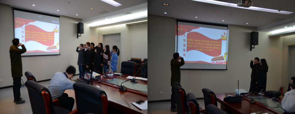 六位申请人分别起立庄严宣读转正申请书,包括自己对党的认识、对入党动机的阐述,对自己工作、学习、公共服务表现的评价(包括缺点),以及今后努力的方向等。何力军、马薇、李普博、李海波、李国龙、杨珮珮及与会其他同志分别对他们在预备期的表现进行评价。随后申请人回避,全体正式党员进行投票表决,监票人为李海波同志,唱票人为苏少鹏同志,计票人为吴迎港同志。申请人回到会场,马薇同志宣布:经表决,与会全体正式党员一致同意通过赵旭、张泽豪、陈卓、李鸿晶、左郁林、麻博超六位同志的转正申请,报上级党组织批准。大家向六位同志表示了祝贺,六位同志依次进行表态发言。支部书记何力军同志带领六位同志及五名新吸收的预备党员面向党旗,庄严地完成入党宣誓。
