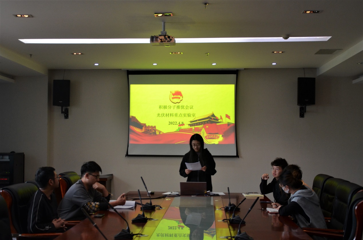 2022年4月8日下午,宁夏光伏材料重点实验室团支部在科技楼A601会议室召开发展对象推优大会,全体学生团员参加。会议由团支部书记祝钰灵同志主持。