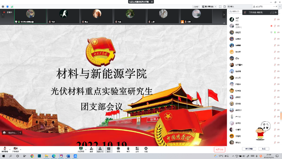 2022年10月19日晚上,学院研究生团支部通过线上形式召开入党积极分子推优大会,会议由团支部书记祝钰灵同学主持,学院全体研究生团员参会。