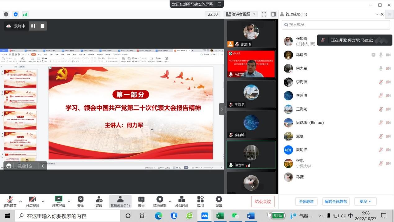 2022年10月27日上午,学院通过线上形式召开直属党支部委员会理论学习中心组第五次学习会,会议由直属党支部书记马建宏同志主持,常务副院长何力军同志领学,直属党支部委员、各党小组组长、各办公室负责人以及教师代表参加会议。