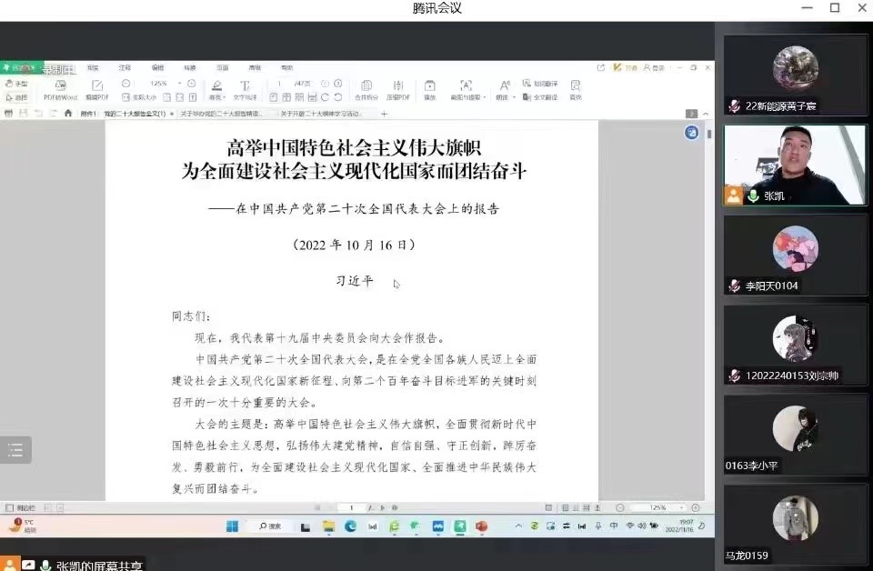 2022年11月16日,根据《关于举办党的二十大精读大赛的通知》(宁大团发〔2022〕52号)要求,学院通过线上形式开展党的二十大精神学习活动,辅导员张凯主持会议,全体本科生参加。