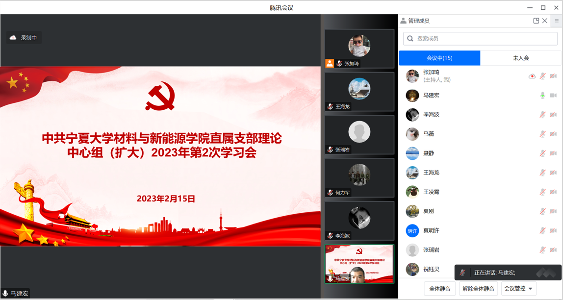 2023年2月15日上午,学院通过线上形式召开2023年直属党支部理论中心组(扩大)第2次学习会,直属党支部书记马建宏主持会议,直属党支部委员、各党小组组委会成员参加会议。