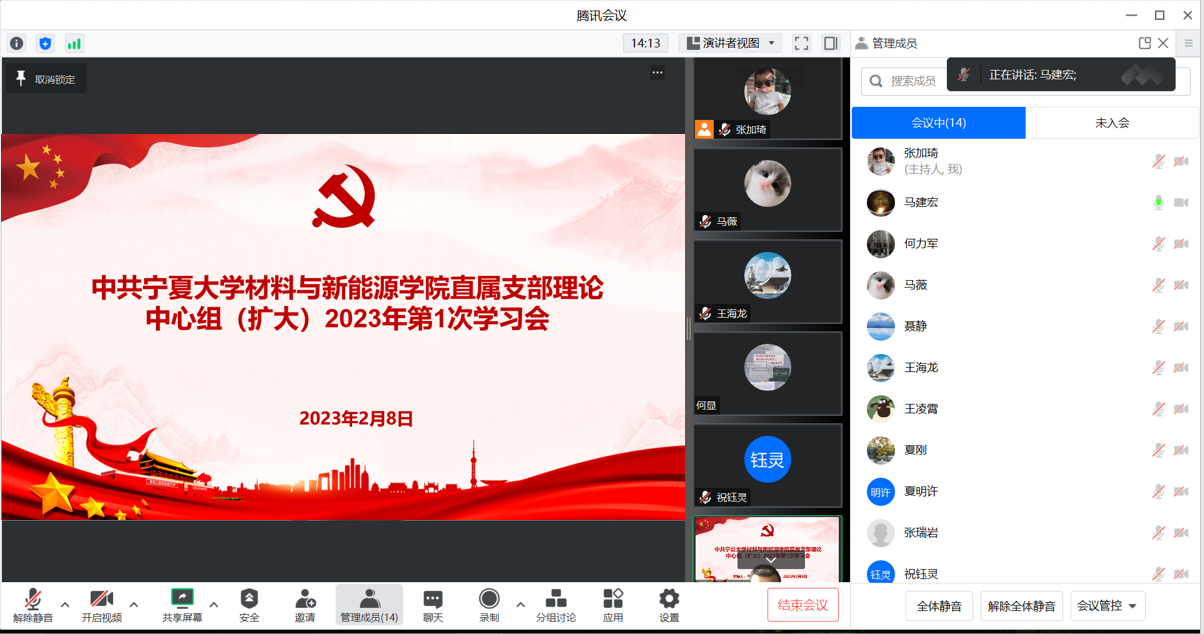 2023年2月8日上午,学院通过线上形式召开2023年直属党支部理论中心组(扩大)第1次学习会,直属党支部书记马建宏主持会议,直属党支部委员、各党小组组委会成员参加会议。