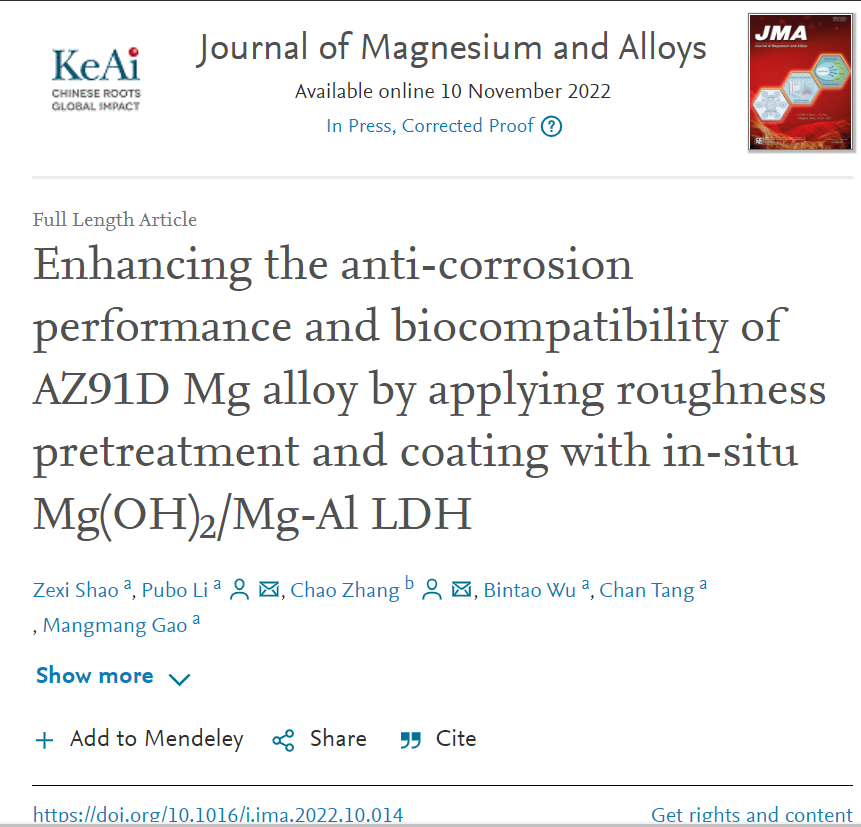 先进工程材料平台李普博副教授、吴斌涛副教授和高忙忙研究员团队在镁合金腐蚀防护和生物相容性能研究领域取得重要进展,工作以“Enhancing the anti-corrosion performance and biocompatibility of AZ91D Mg alloy by applying roughness pretreatment and coating with in-situ Mg(OH)2/Mg-Al LDH”为题发表于镁合金材料国际顶级学术期刊《Journal of Magnesium and Alloys》,影响因子达到11.8。学院2022届硕士研究生邵泽西为第一作者,成人论坛