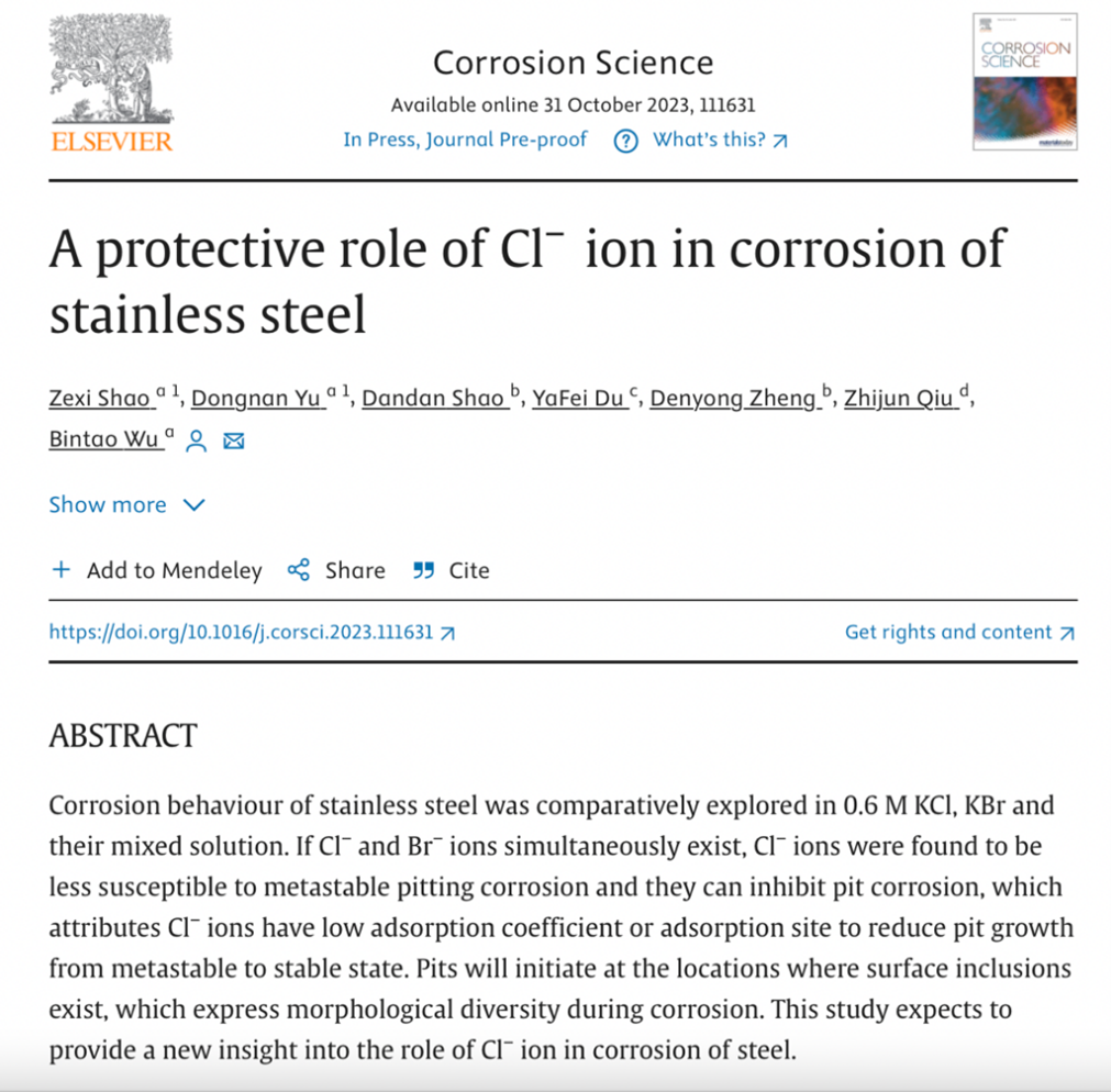 近日,成人论坛 吴斌涛副教授团队联合中船黄埔文冲船舶有限公司邵丹丹工程师团队在金属腐蚀研究中取得新进展。团队研究发现氯离子在钢腐蚀中可以起到一定的防护作用,相关成果以“A protective role of Cl−ion in corrosion of stainless steel”为题发表在国际知名期刊《Corrosion Science》(中科院一区TOP),成人论坛 为第一单位,邵泽西博士为第一作者,吴斌涛为通讯作者。