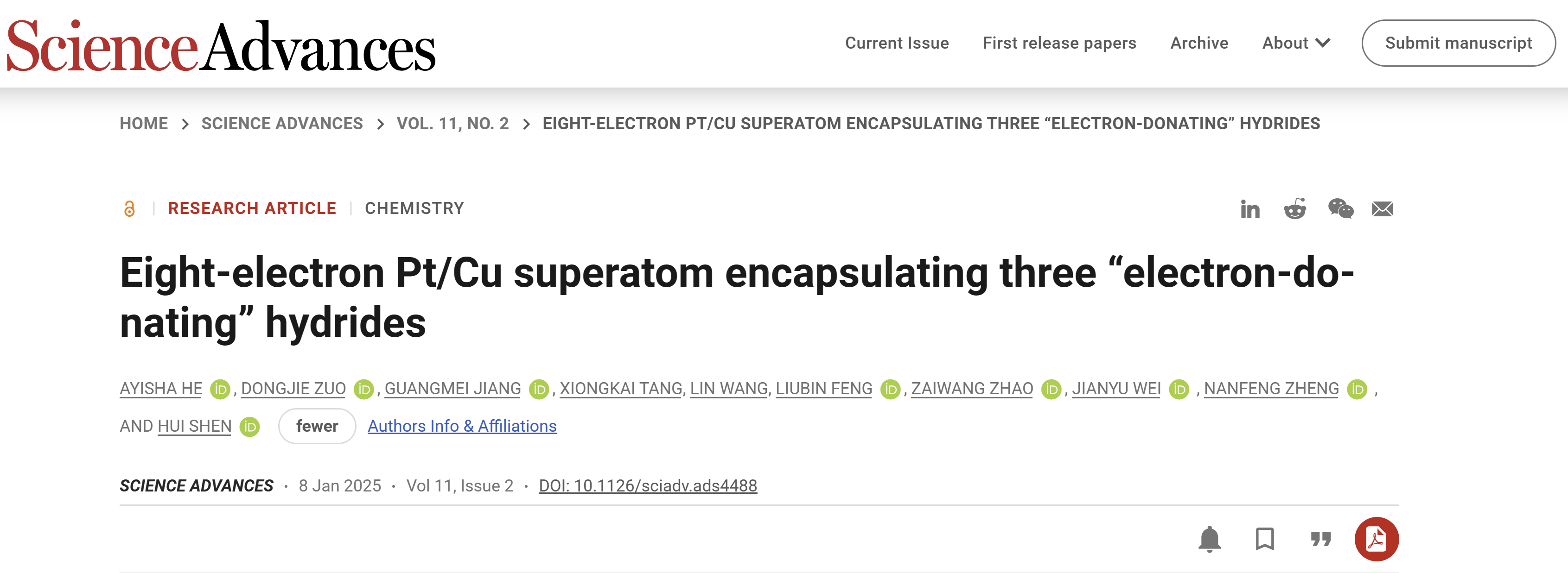 近日,成人论坛 魏建宇课题组与内蒙古大学沈慧教授团队、厦门大学郑南峰院士团队通力合作,在纳米团簇中的“金属氢”领域取得了突破性成果。他们成功将单个团簇中“金属氢”的数目提升至3个。相关研究成果以“Eight-Electron Pt/Cu Superatom Encapsulating Three “Electron-Donating”Hydrides”为题,于2025年1月8日在Science Advances上发表。