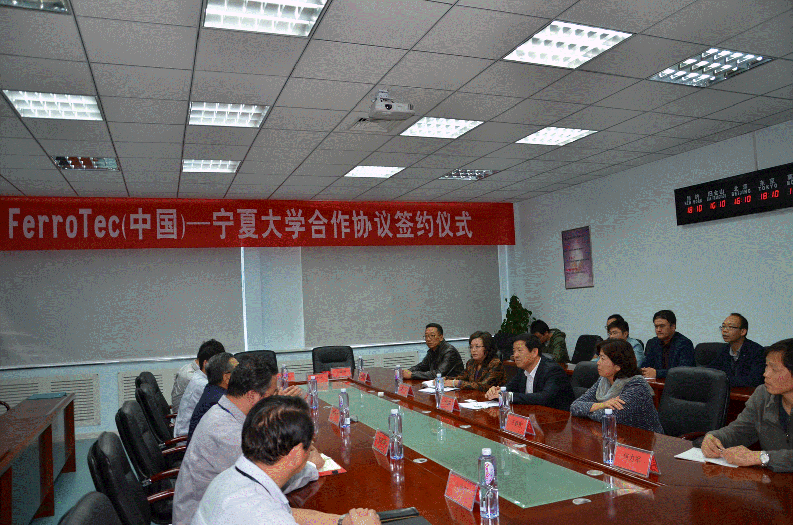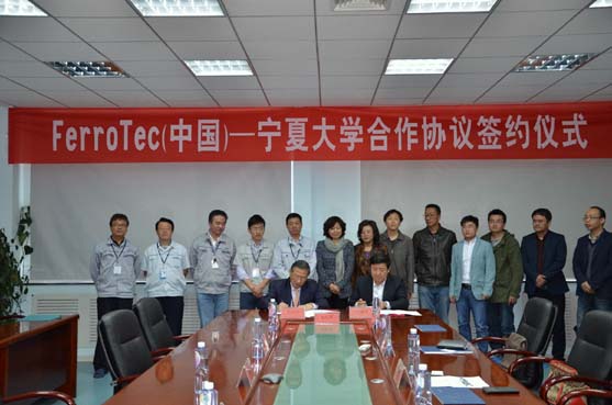 2015年10月10日,何建国校长与Ferrotec(中国)总裁贺贤汉在宁夏银和新能源科技有限公司签署成人论坛 与Ferrotec(中国)合作协议。王春秀副校长、宁夏银和新能源科技有限公司总经理浩育洲参加了签字仪式。出席仪式的还有宁夏光伏材料重点实验室主任李进、副主任何力军、实验室科研骨干及企业方主要部门负责人等。