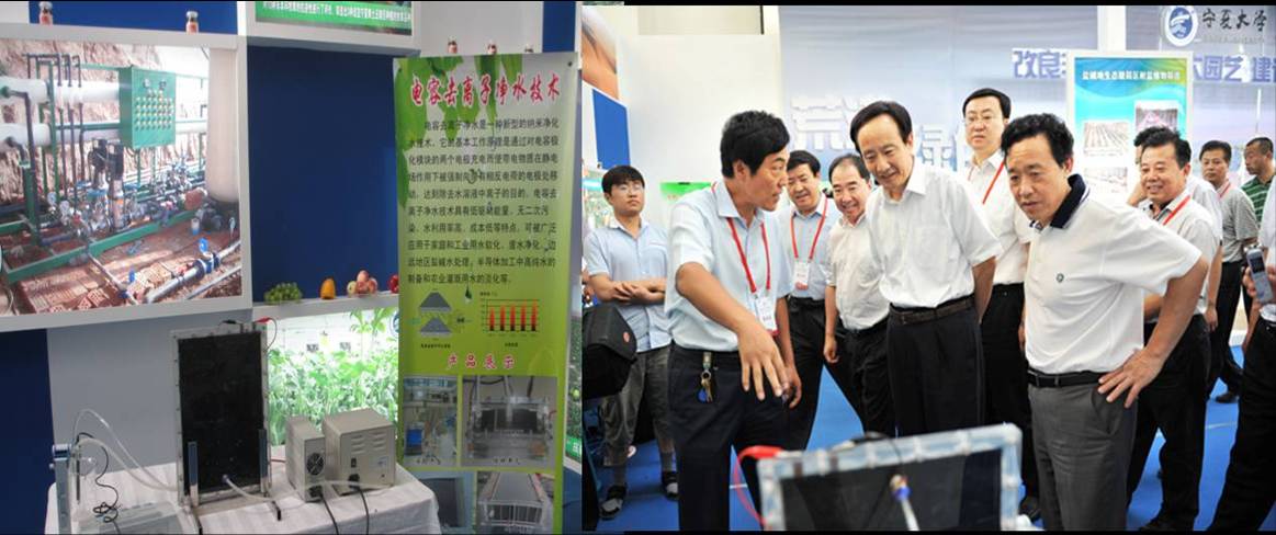 领导齐岳、何建国、许兴的陪同下观摩了我实验室展位。副校长许兴向李建华书记介绍电容去离子净水技术。该技术由我实验室李海波博士主持开发,是一种新型的纳米净化水技术,具有低驱动能量、无二次污染、水利用率高、成本低等特点,可被广泛应用于工业废水处理、盐碱水处理、半导体加工中高纯水的制备和农业灌溉用水的淡化等领域,目前已获得中国、美国专利,在澳大利亚的专利申请也在审批中。李建华书记饶有兴趣地听取了有关的介绍,指出这项技术非常适合于在我区应用。