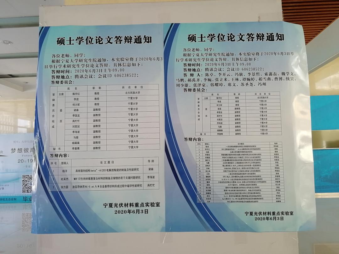 进入新冠疫情防控常态化阶段以来,宁夏光伏材料重点实验室严格遵守和落实学校有关文件会议精神和要求,一方面做好疫情防控工作,一方面有序推进教学科研工作的开展。2020年6月3日,2020届首次硕士研究生学位论文答辩工作在网上进行,分散在全国十几个省区共24名同学参加了答辩。答辩委员会成员参会地点在成人论坛