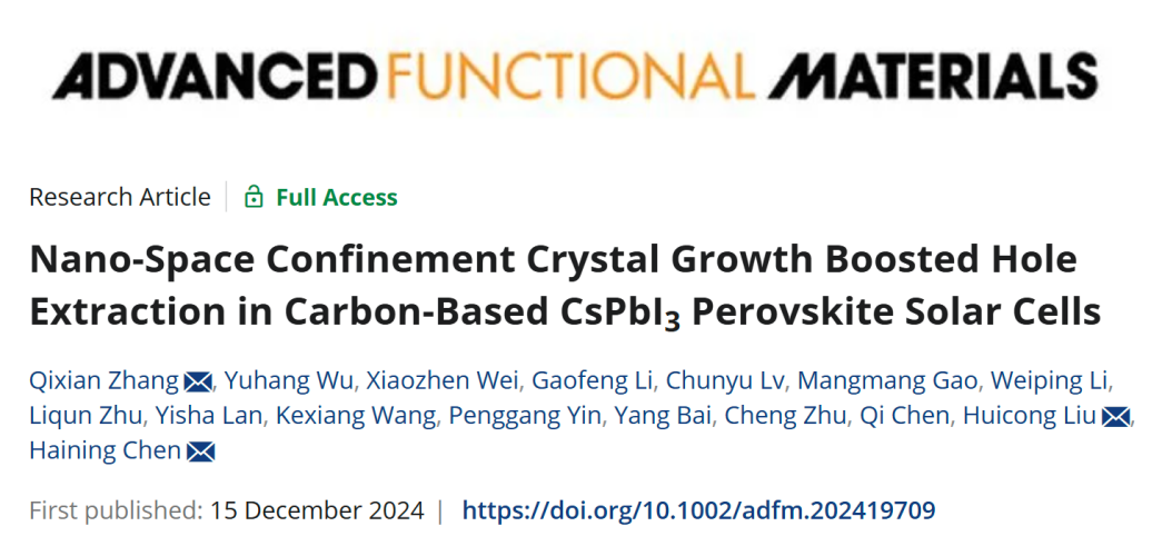 近日,学院光伏组件回收及高值利用团队青年教师张啟先在全无机碳基钙钛矿太阳能电池研究中取得重要进展,相关工作以“Nano-Space Confinement Crystal Growth Boosted Hole Extraction in Carbon-Based CsPbI3Perovskite Solar Cells”为题发表在材料科学领域国际权威期刊《Advanced Functional Materials》(Q1/IF 18.5),成人论坛