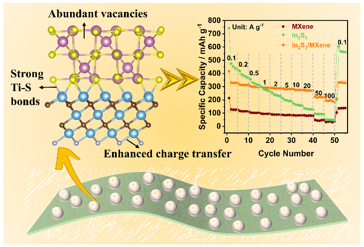 文章为解决金属硫化物因低电导率和巨大体积变化导致的扩散动力学缓慢的问题,首次开发了具有高密度空位和强界面键合的缺陷型三维In2S3/MXene纳米结构,并作为钠离子电池快充负极。该设计使材料具有较低的Na+扩散能垒(0.28 eV)和吸附能(-1.68 eV)、较高的Na+扩散系数(5.01 × 10-12cm2s-1)和赝电容贡献率(97.3%),并表现出可逆多步插层转化反应机理和良好电化学反应动力学。基于此,所组装的钠离子电池具有卓越的倍率性能(100 A g-1时容量为202.2 mAh g-1,67秒即可完成一次充电)和长循环稳定性(20 A g-1电流密度下循环5000次后,每循环容量仅衰减0.0074%)。本研究为高倍率、长寿命钠存储器件的功能电极材料设计与开发提供了新思路。