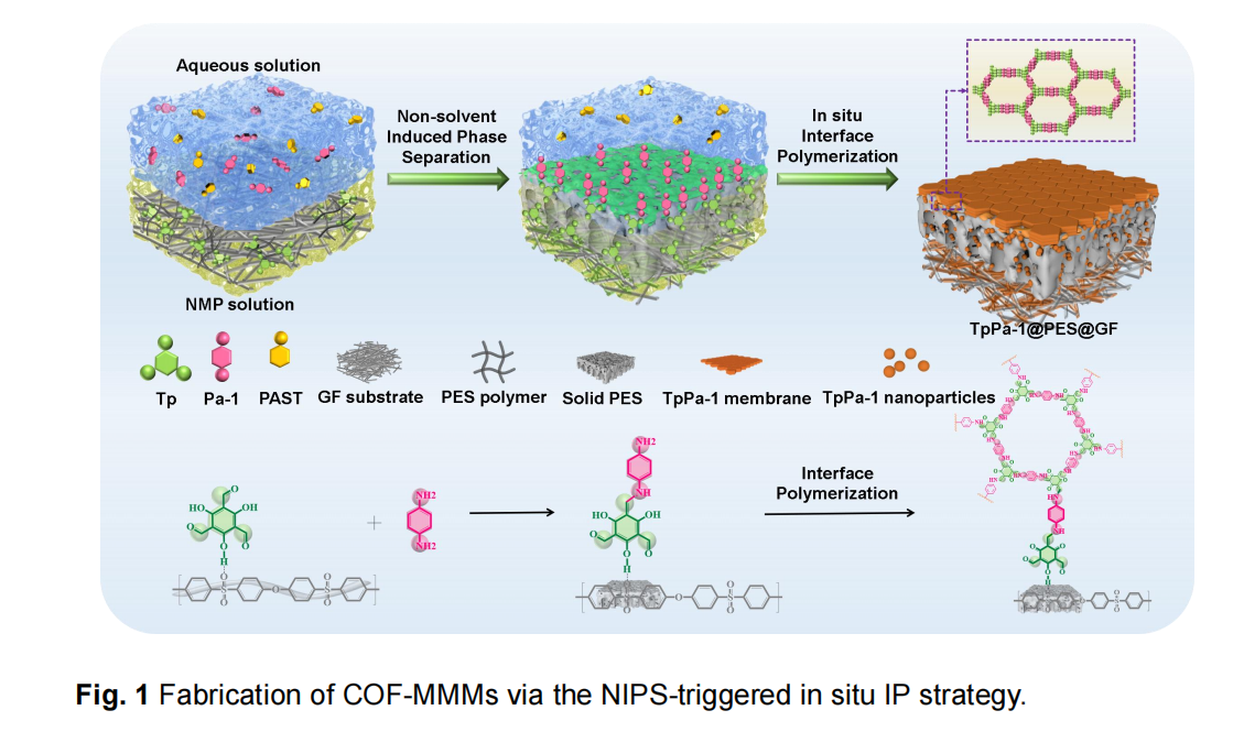 团队提出了一种非溶剂诱导相分离(NIPS)–触发原位界面聚合(IP)的协同策略,首次实现了厘米级无缺陷COF混合基质膜(COF-MMMs)的可控构筑。在相分离过程中,聚醚砜(PES)基体形成多孔支撑层,而界面聚合在表层同步发生,生成仅15–30nm厚的致密COF膜层。这种自适应双层生长机制使COF纳米晶(4–8nm)均匀嵌入PES基体中,形成无缝结合的“非对称一体化结构”。研究揭示了界面原位聚合与相分离动力学协同调控在实现无缺陷COF混合基质膜制备中的关键作用,为解决多相界面不兼容这一长期难题提供了新策略。