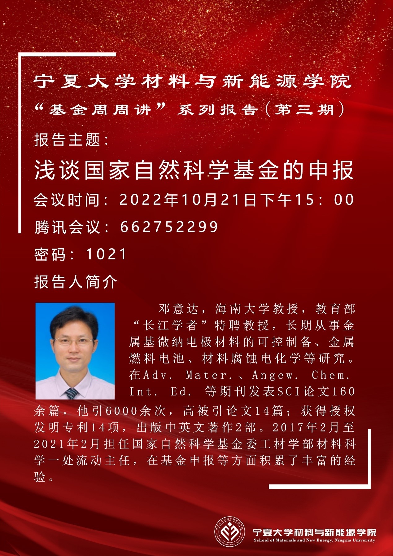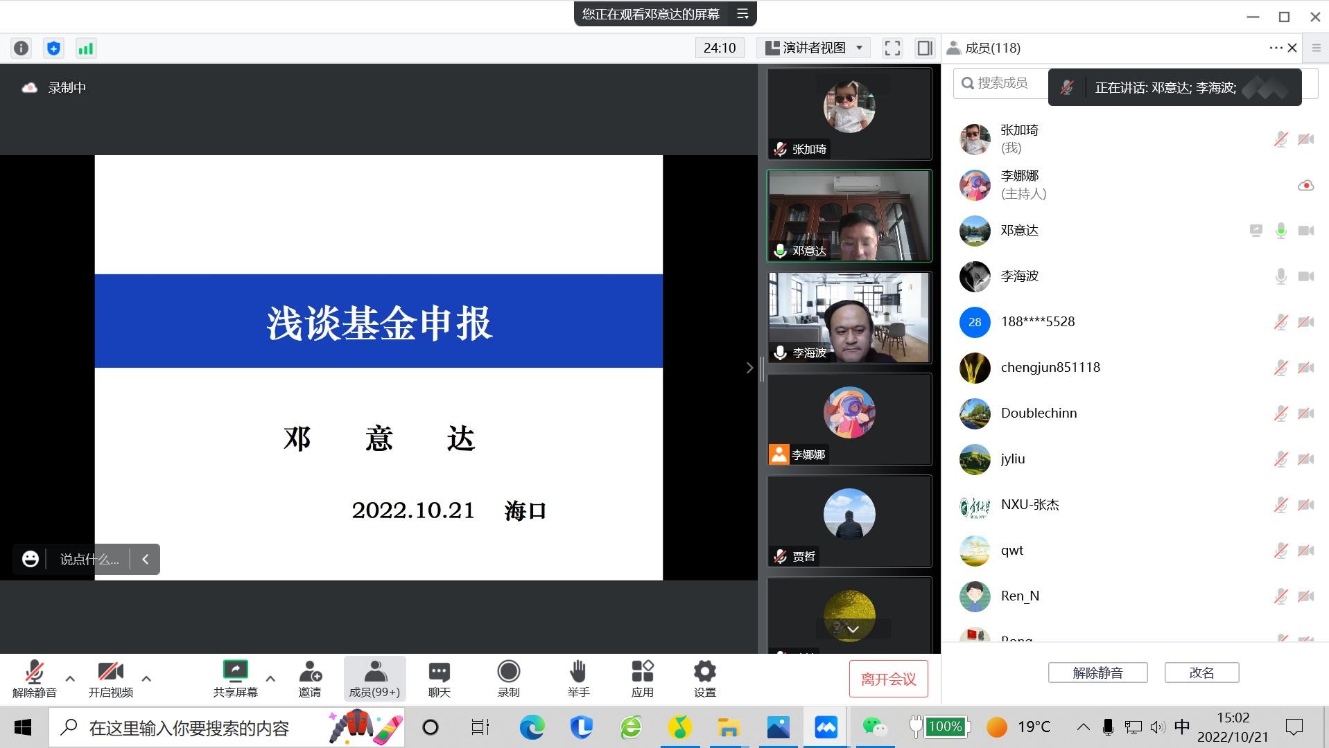 2022年10月21日下午,学院通过线上会议形式举办了“基金周周讲”第三期报告。报告由李海波副院长主持,海南大学邓意达教授主讲,学院全体教师参加,全国高校相关领域教师聆听了报告。