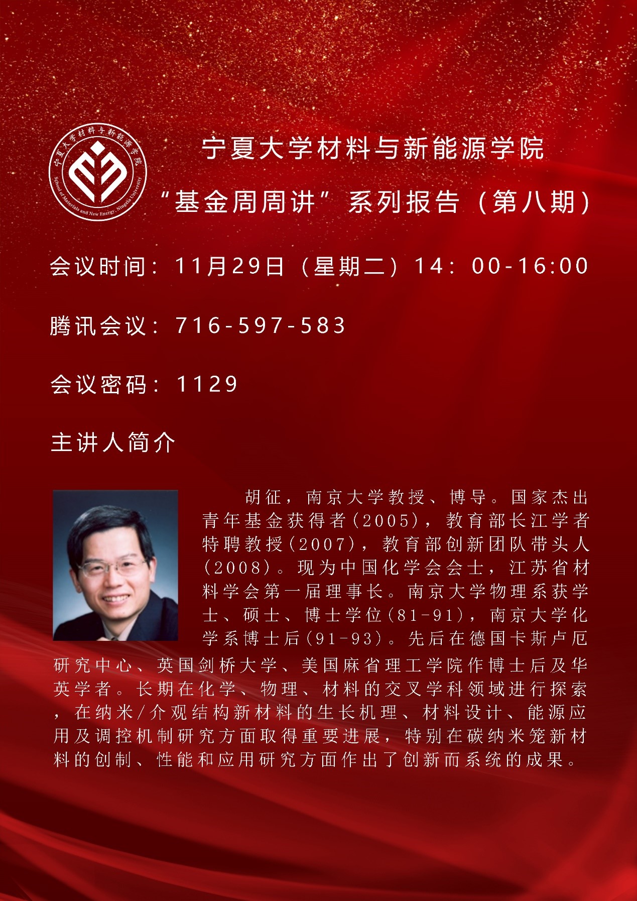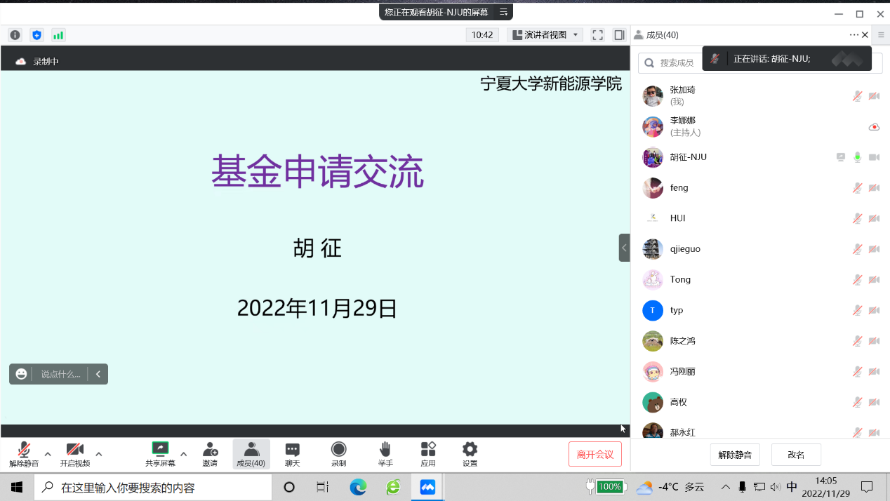 2022年11月29日下午,学院通过线上会议形式举办了“基金周周讲”第八期报告,邀请南京大学胡征教授主讲,成人论坛 及相关学院教师参加,报告会由学院院长夏明许主持。