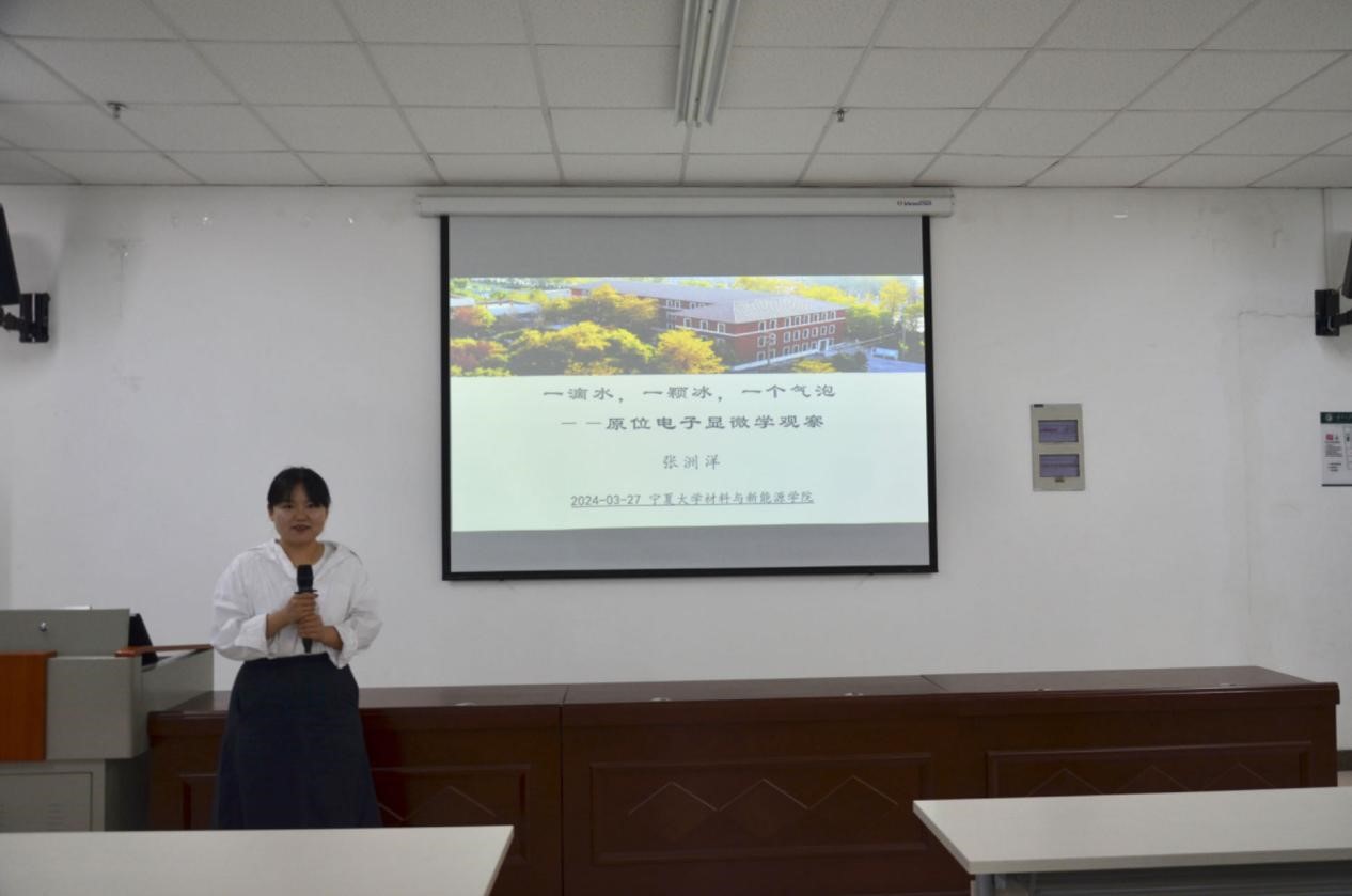 2024年3月27日下午在贺兰山校区科技楼B301会议室,张洲洋博士作了题为“一滴水,一颗冰,一个气泡——原位电子显微镜学观察”的学术报告。这是成人论坛