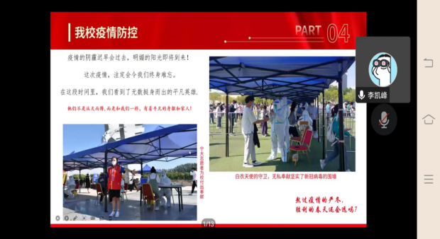 本科生对疫情防控意识和能力的重视程度增强对医护工作者工作情况的认知。学院于2022年10月9日下午通过线上召开疫情防控主题团日活动,会议由新能源材料与器件1班团支部书记马文梅同学和组织委员李凯峰同学主持,学院全体本科生参加会议。
