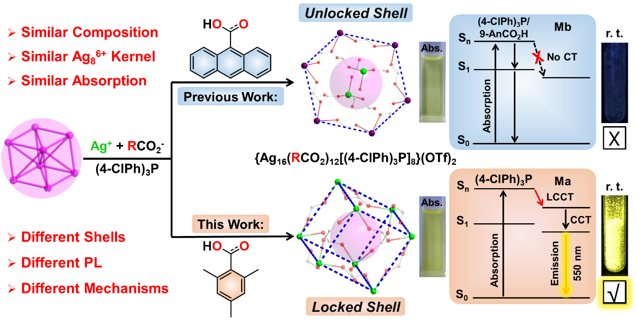 金属纳米团簇因其独特的物理化学性质,在催化、传感、光电器件等领域展现出广阔的应用前景。然而,如何精准调控其界面结构以实现高性能室温发光,一直是该领域的研究难点。刘教授团队创新性地提出了一种基于“空间位阻诱导界面结构锁定”的策略,成功设计并合成了两种原子级精确的单羧酸保护银纳米团簇。