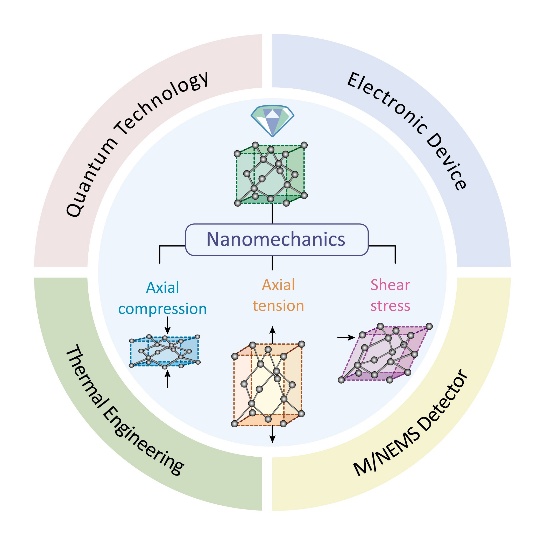 金刚石因其超宽带隙、超高热导率、卓越的载流子迁移率和高击穿电场等一系列非凡特性,被视为下一代高功率、高频和量子器件的革命性材料。然而,可靠的化学掺杂难题以及块体金刚石在应变下的脆性失效,制约了其在半导体器件中的实际应用。近年来,一种基于纳米力学的“深应变工程”(deep strain engineering, DSE)策略为实现金刚石电子性能的可控与深度调节提供了全新的解决方案。