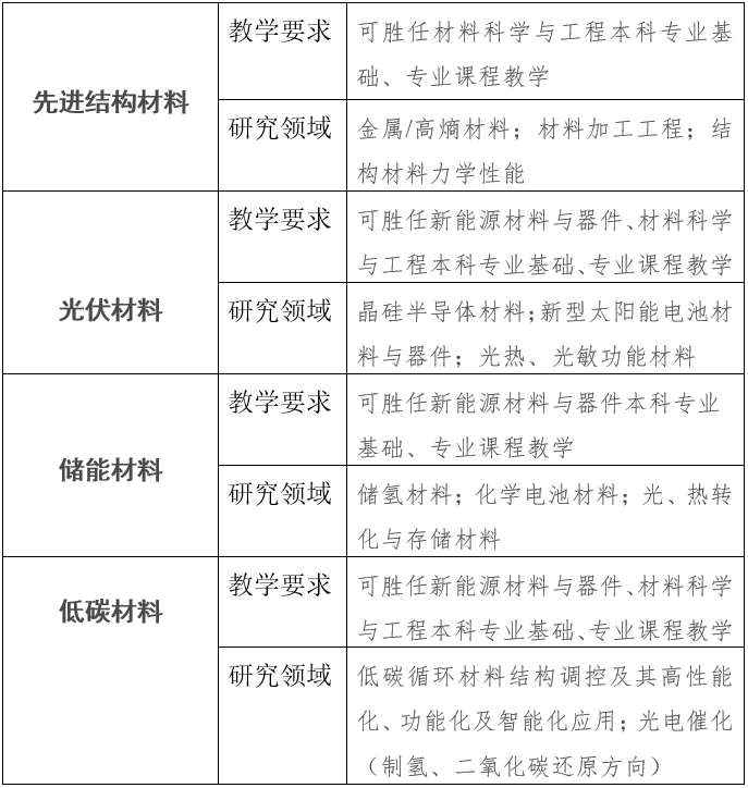 35岁以下,具有博士学位,在材料、新能源领域取得较好的学术成果,有从事较高水平教学、科研工作潜力的优秀青年学者(本科专业属于材料者优先)。